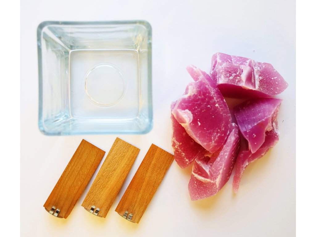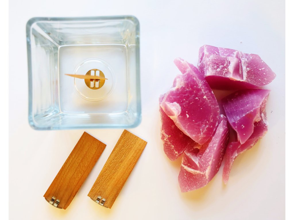 V sadě najdete elegantní svícen o objemu cca 240 g vosku, hned 3 dřevěné knoty s plíšky pro snadné uchycení, lepicí kolečko je součásti plíšku a také vosk (směs sojového a palmového).