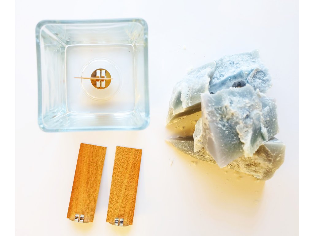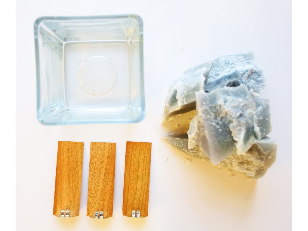 V sadě najdete elegantní svícen o objemu cca 240 g vosku, hned 3 dřevěné knoty s plíšky pro snadné uchycení, lepicí kolečko je součásti plíšku a také vosk (směs sojového a palmového).