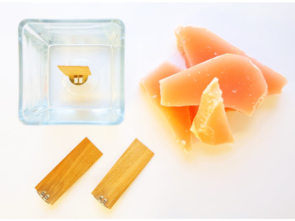 V sadě najdete elegantní svícen o objemu cca 470 g vosku, hned 3 dřevěné knoty s plíšky pro snadné uchycení, lepicí kolečko je součásti plíšku a také vosk (směs sojového a palmového).