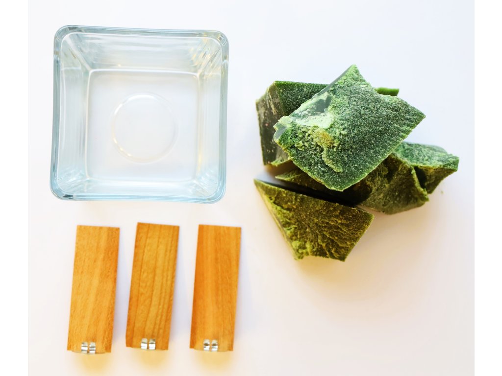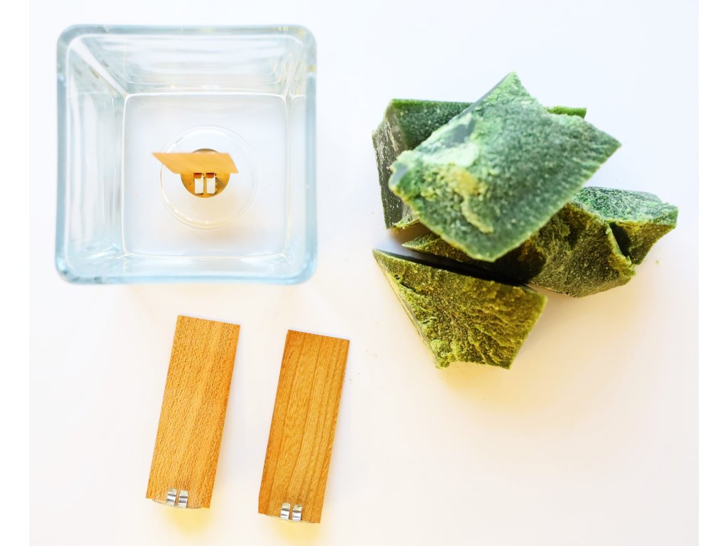 V sadě najdete elegantní svícen o objemu cca 240 g vosku, hned 3 dřevěné knoty s plíšky pro snadné uchycení, lepicí kolečko je součásti plíšku a také vosk (směs sojového a palmového).