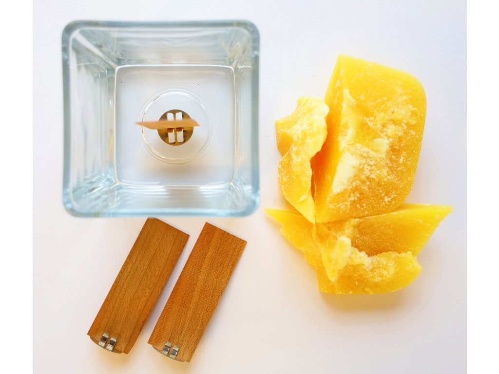 V sadě najdete elegantní svícen o objemu cca 470 g vosku, hned 3 dřevěné knoty s plíšky pro snadné uchycení, lepicí kolečko je součásti plíšku a také vosk (směs sojového a palmového).