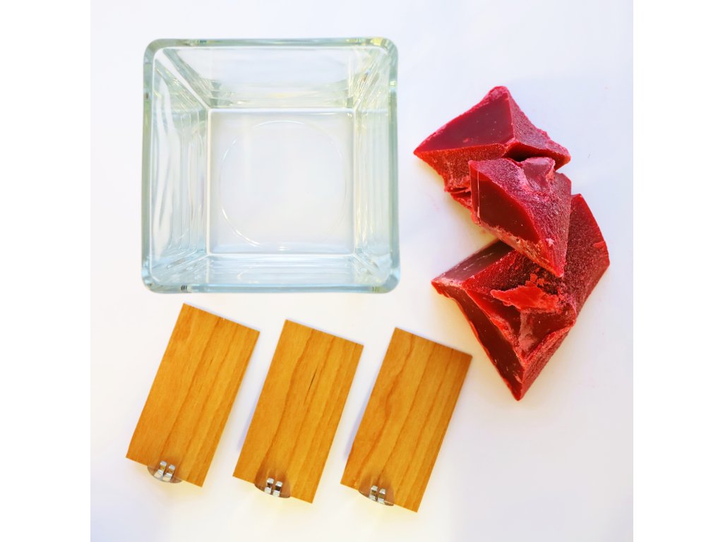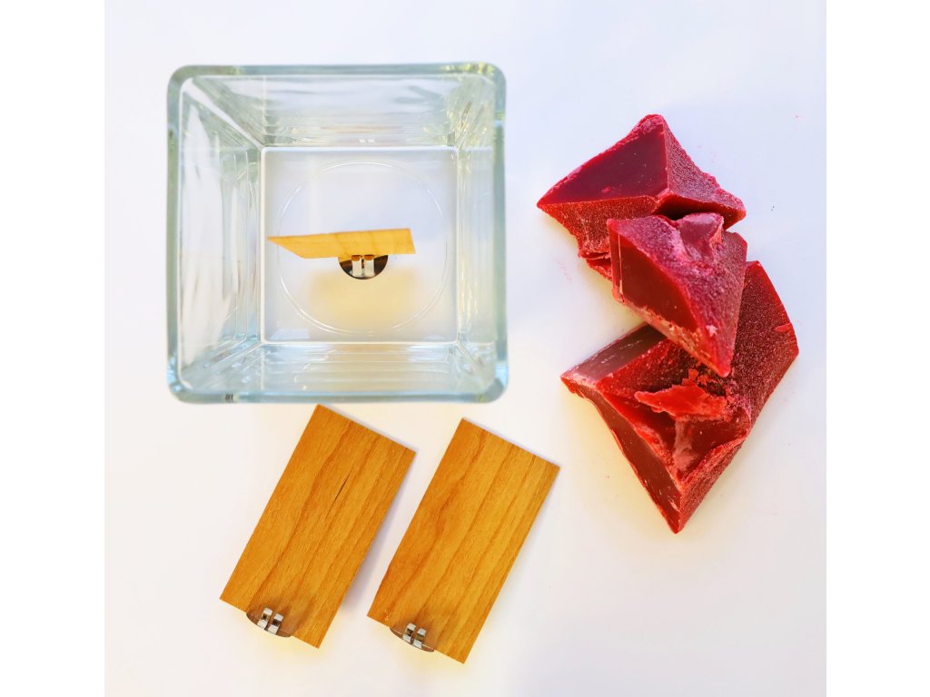V sadě najdete elegantní svícen o objemu cca 750 g vosku, hned 3 dřevěné knoty s plíšky pro snadné uchycení, lepicí kolečko je součásti plíšku a také vosk (směs sojového a palmového).