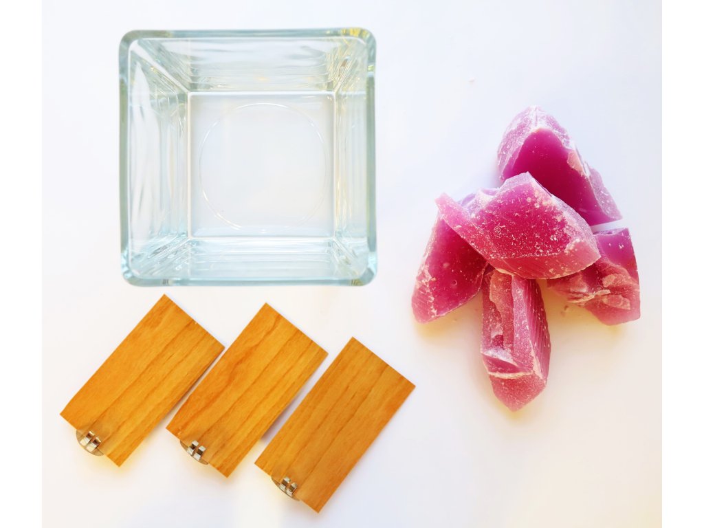 V sadě najdete elegantní svícen o objemu cca 750 g vosku, hned 3 dřevěné knoty s plíšky pro snadné uchycení, lepicí kolečko je součásti plíšku a také vosk (směs sojového a palmového).
