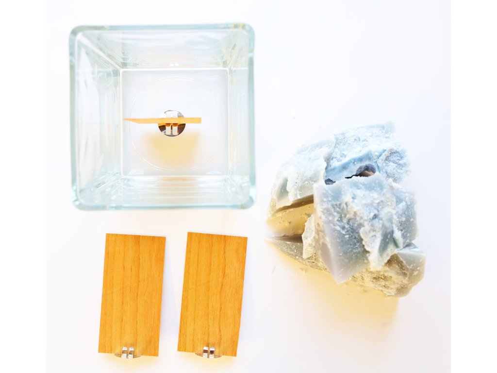 V sadě najdete elegantní svícen o objemu cca 750 g vosku, hned 3 dřevěné knoty s plíšky pro snadné uchycení, lepicí kolečko je součásti plíšku a také vosk (směs sojového a palmového).