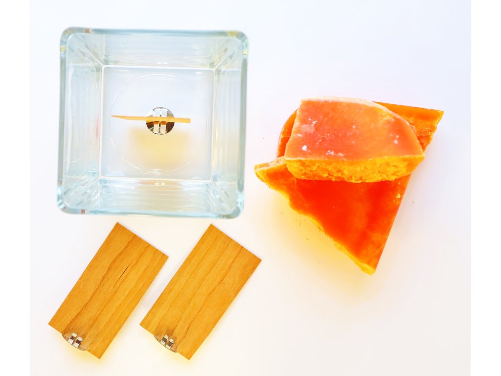 V sadě najdete elegantní svícen o objemu cca 750 g vosku, hned 3 dřevěné knoty s plíšky pro snadné uchycení, lepicí kolečko je součásti plíšku a také vosk (směs sojového a palmového).