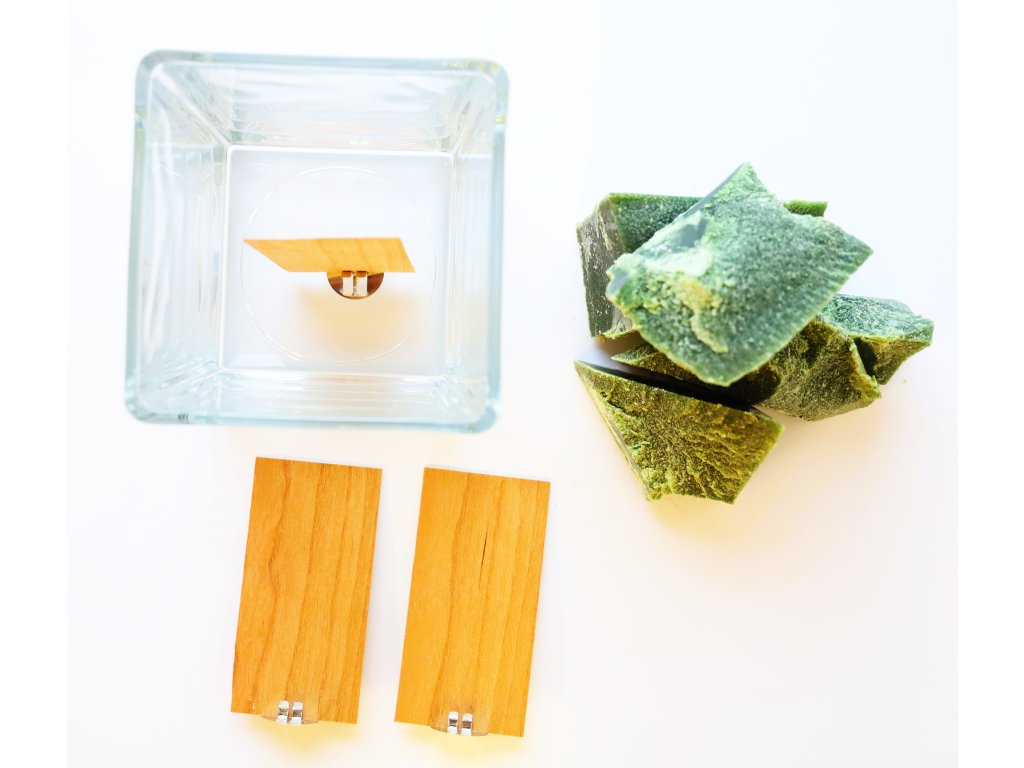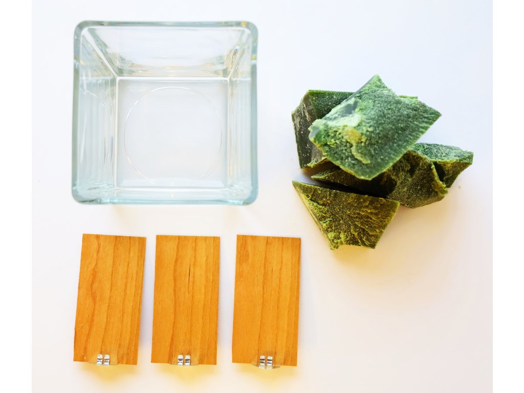 V sadě najdete elegantní svícen o objemu cca 750 g vosku, hned 3 dřevěné knoty s plíšky pro snadné uchycení, lepicí kolečko je součásti plíšku a také vosk (směs sojového a palmového).