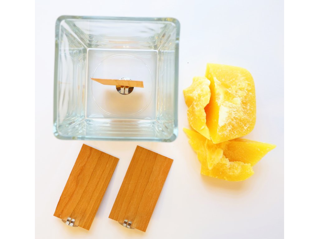 V sadě najdete elegantní svícen o objemu cca 750 g vosku, hned 3 dřevěné knoty s plíšky pro snadné uchycení, lepicí kolečko je součásti plíšku a také vosk (směs sojového a palmového).