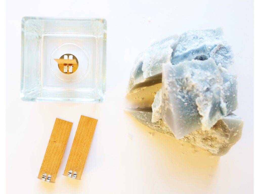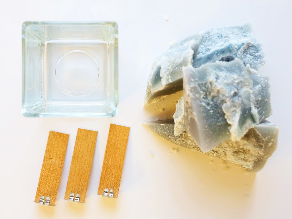 V sadě najdete elegantní svícen o objemu cca 240 g vosku, hned 3 dřevěné knoty s plíšky pro snadné uchycení, lepicí kolečko je součásti plíšku a také vosk (směs sojového a palmového).