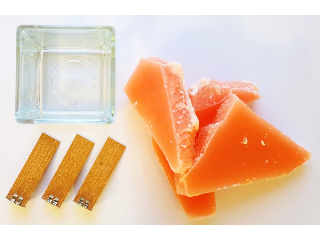 V sadě najdete elegantní svícen o objemu cca 240 g vosku, hned 3 dřevěné knoty s plíšky pro snadné uchycení, lepicí kolečko je součásti plíšku a také vosk (směs sojového a palmového).