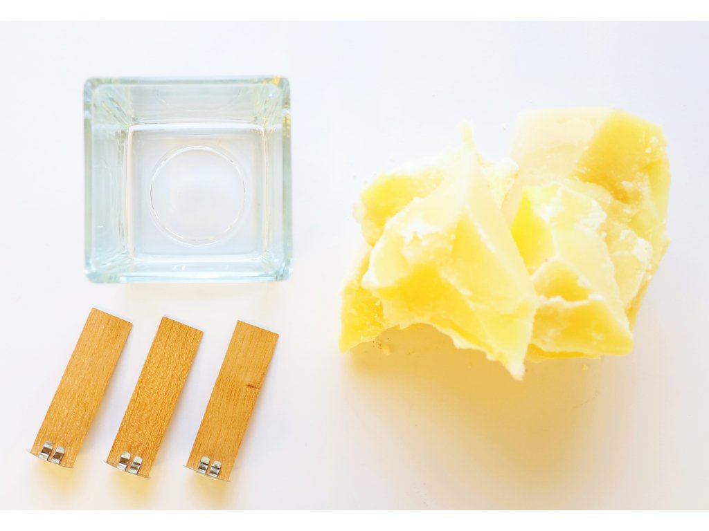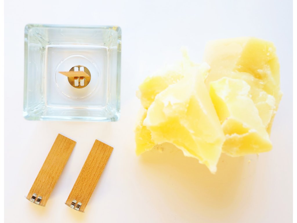 V sadě najdete elegantní svícen o objemu cca 240 g vosku, hned 3 dřevěné knoty s plíšky pro snadné uchycení, lepicí kolečko je součásti plíšku a také vosk (směs sojového a palmového).
