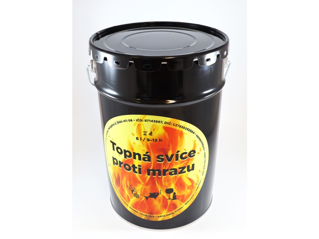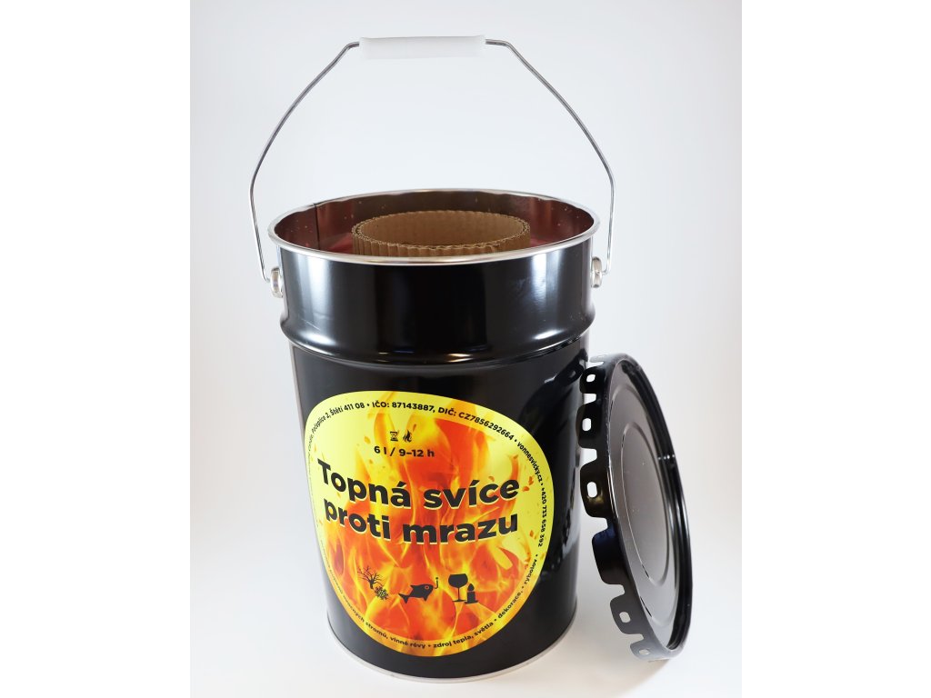 Díky obsahu 6 litrů topného vosku a kvalitnímu kovovému obalu s víkem hoří svíce až 12 hodin bez kolísání plamene, a navíc je možné ji po odeznění mrazu opětovně zapálit. Praktický plechový kbelík s drátěným uchem je stabilní, odolný vůči deformaci a snadno se s ním manipuluje i v terénu. Velkou parádou je rychle odnímatelné víko které Vás nebude zdržovat při zapalování několika svící najednou.